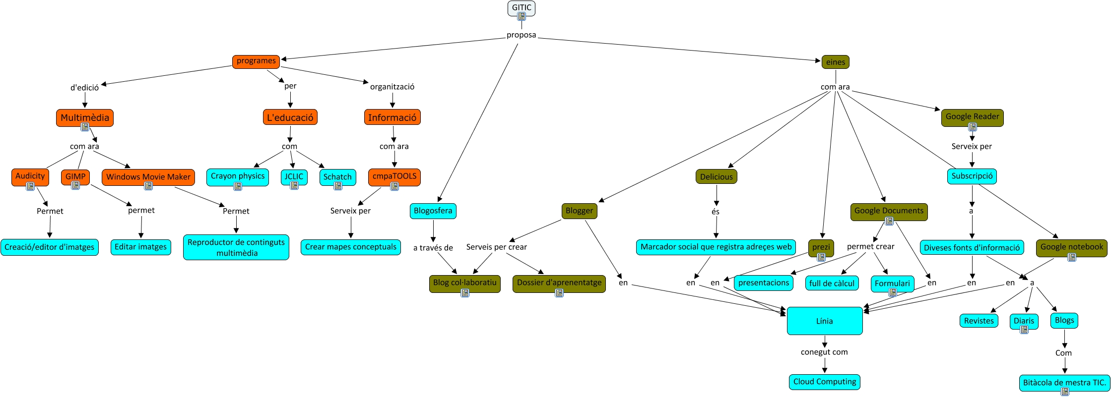 Este Cmap, tiene información relacionada con: mapa, eines com ara Google Documents, Blogger en Línia, Google Reader Serveix per Subscripció, Google notebook en Línia, Línia conegut com Cloud Computing, programes per L'educació, GIMP permet Editar imatges, Blogosfera a través de Blog col·laboratiu, Diveses fonts d'informació a Blogs, Google Documents permet crear Formulari, Windows Movie Maker Permet Reproductor de continguts multimèdia, Delicious és Marcador social que registra adreçes web, L'educació com Schatch, Multimèdia com ara GIMP, cmpaTOOLS Serveix per Crear mapes conceptuals, programes d'edició Multimèdia, Diveses fonts d'informació en Línia, prezi en Línia, Google Documents permet crear presentacions, Diveses fonts d'informació a Revistes