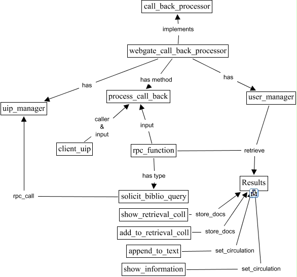 Este Cmap, tiene información relacionada con: webgate.webgate_call_back_processor, rpc_function has type solicit_biblio_query, append_to_text set_circulation Results, webgate_call_back_processor has user_manager, show_information set_circulation Results, show_retrieval_coll store_docs Results, rpc_function retrieve Results, solicit_biblio_query rpc_call uip_manager, client_uip caller & input process_call_back, rpc_function input process_call_back, webgate_call_back_processor has uip_manager, webgate_call_back_processor implements call_back_processor, webgate_call_back_processor has method process_call_back, user_manager retrieve Results, add_to_retrieval_coll store_docs Results