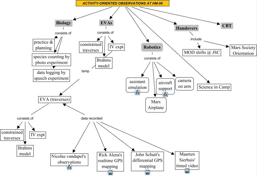 Den här kartan innehåller information om: Activity-Oriented Records, Handovers include Mars Society Orientation, EVAs consists of Brahms model, Handovers include MOD shifts @ JSC, Robotics consists of assistant emulation, Biology consists of practice & planning, IV expt temp EVA (traverses), Biology consists of species counting by photo experiment, EVA (traverses) consists of Brahms model, EVAs consists of constrained traverses, Robotics consists of Mars Airplane, EVA (traverses) consists of IV expt, Robotics consists of aircraft support, EVA (traverses) consists of constrained traverses, Biology consists of data logging by speech experiment, Robotics consists of camera on arm, EVAs consists of IV expt