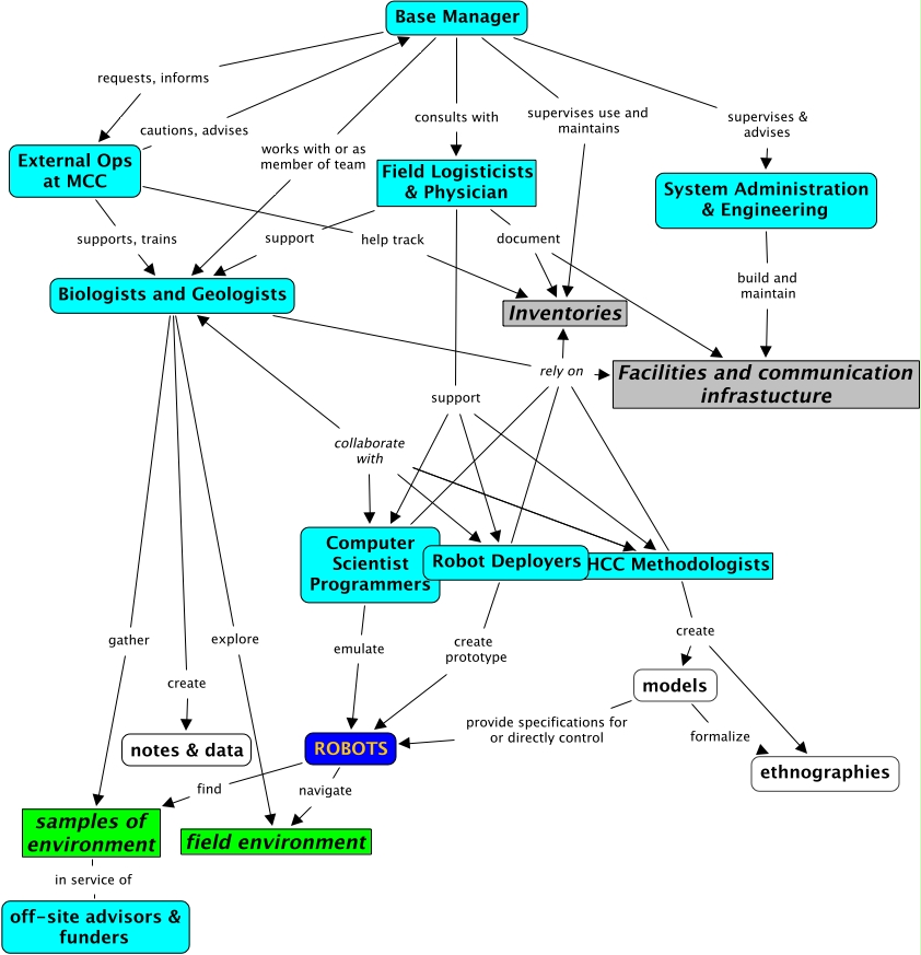 Role Relationships at HM-99, Base Manager supervises use and maintains Inventories, HCC Methodologists collaborate with Robot Deployers, samples of environment in service of off-site advisors & funders, Field Logisticists & Physician support Biologists and Geologists, Robot Deployers create prototype ROBOTS, External Ops at MCC help track Inventories, Computer Scientist Programmers emulate ROBOTS, HCC Methodologists collaborate with Computer Scientist Programmers, Biologists and Geologists explore field environment, HCC Methodologists collaborate with Biologists and Geologists
