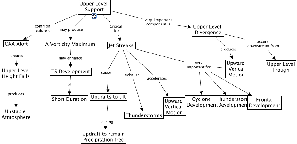 This Concept Map, created with IHMC CmapTools, has information related to: Upper Level Support 06 Apr 2000, Jet Streaks very Important for Frontal Development, Upward Verical Motion very Important for Cyclone Development, Upper Level Support common feature of CAA Aloft, Upper Level Support Critical for Jet Streaks, Upper Level Support very Important component is Upper Level Divergence, Jet Streaks accelerates Upward Vertical Motion, Upward Verical Motion very Important for Thunderstorm Development, Upper Level Divergence occurs downstream from Upper Level Trough, CAA Aloft creates Upper Level Height Falls, Upper Level Divergence produces Upward Verical Motion, Jet Streaks cause Updrafts to tilt, Jet Streaks very Important for Cyclone Development, Upper Level Height Falls produces Unstable Atmosphere, Jet Streaks exhaust Thunderstorms, TS Development of Short Duration, A Vorticity Maximum may enhance TS Development, Jet Streaks very Important for Thunderstorm Development, Updrafts to tilt causing Updraft to remain Precipitation free, Upper Level Support may produce A Vorticity Maximum, Upward Verical Motion very Important for Frontal Development