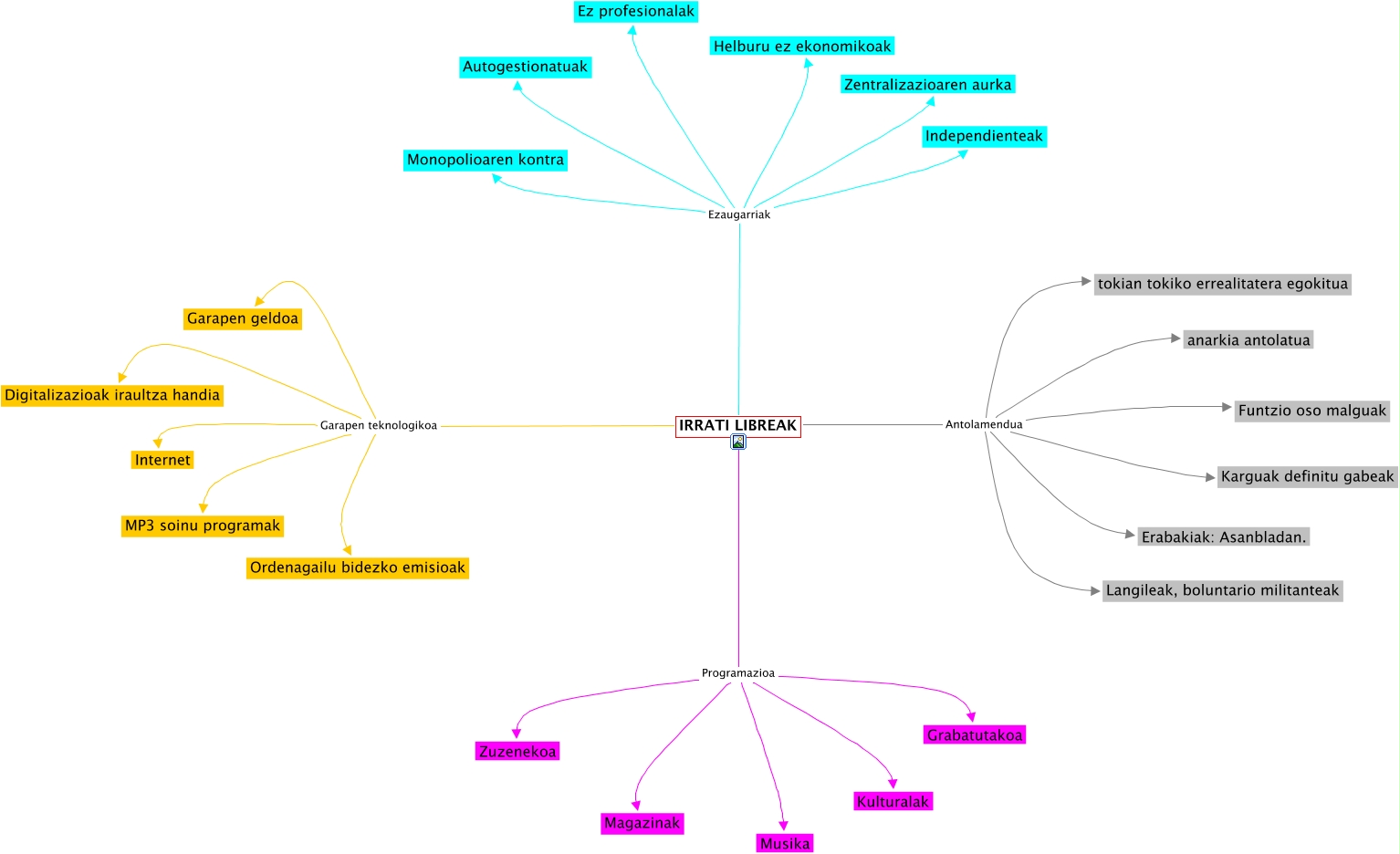 This Concept Map, created with IHMC CmapTools, has information related to: Irrati Libreak, IRRATI LIBREAK Programazioa Grabatutakoa, IRRATI LIBREAK Antolamendua Karguak definitu gabeak, IRRATI LIBREAK Programazioa Zuzenekoa, IRRATI LIBREAK Ezaugarriak Ez profesionalak, IRRATI LIBREAK Antolamendua Langileak, boluntario militanteak, IRRATI LIBREAK Antolamendua Erabakiak: Asanbladan., IRRATI LIBREAK Garapen teknologikoa Digitalizazioak iraultza handia, IRRATI LIBREAK Antolamendua tokian tokiko errealitatera egokitua, IRRATI LIBREAK Garapen teknologikoa Ordenagailu bidezko emisioak, IRRATI LIBREAK Ezaugarriak Zentralizazioaren aurka, IRRATI LIBREAK Programazioa Kulturalak, IRRATI LIBREAK Garapen teknologikoa Garapen geldoa, IRRATI LIBREAK Programazioa Musika, IRRATI LIBREAK Ezaugarriak Autogestionatuak, IRRATI LIBREAK Antolamendua Funtzio oso malguak, IRRATI LIBREAK Ezaugarriak Independienteak, IRRATI LIBREAK Ezaugarriak Helburu ez ekonomikoak, IRRATI LIBREAK Ezaugarriak Monopolioaren kontra, IRRATI LIBREAK Garapen teknologikoa MP3 soinu programak, IRRATI LIBREAK Garapen teknologikoa Internet