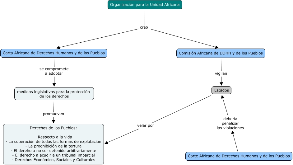 This Concept Map, created with IHMC CmapTools, has information related to: Ambito africano, Organización para la Unidad Africana creo Carta Africana de Derechos Humanos y de los Pueblos, Organización para la Unidad Africana creo Comisión Africana de DDHH y de los Pueblos, medidas legislativas para la protección de los derechos promueven Derechos de los Pueblos: - Respecto a la vida - La superación de todas las formas de explotación - La proohibición de la tortura - El dereho a no ser detenido arbitrariamente - El derecho a acudir a un tribunal imparcial - Derechos Económico, Sociales y Culturales, Corte Africana de Derechos Humanos y de los Pueblos debería penalizar las violaciones Estados, Estados velar por Derechos de los Pueblos: - Respecto a la vida - La superación de todas las formas de explotación - La proohibición de la tortura - El dereho a no ser detenido arbitrariamente - El derecho a acudir a un tribunal imparcial - Derechos Económico, Sociales y Culturales, Carta Africana de Derechos Humanos y de los Pueblos se compromete a adoptar medidas legislativas para la protección de los derechos, Comisión Africana de DDHH y de los Pueblos vigilan Estados