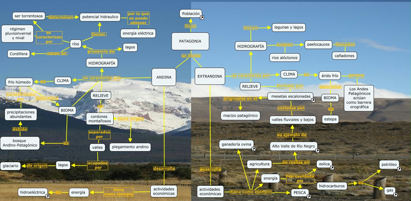 This Concept Map, created with IHMC CmapTools, has information related to: Final 4°2a, actividades económicas tiene como ejemplo agricultura, ANDINA desarrolla actividades económicas, EXTRANDINA se caracteriza por CLIMA, RELIEVE es cordones montañosos, mesetas escalonadas originadas en el macizo patagónico, cordones montañosos separados por valles, RELIEVE formado por mesetas escalonadas, EXTRANDINA se caracteriza por RELIEVE, HIDROGRAFÍA presencia de lagos, actividades económicas tiene como ejemplo ganadería ovina, PATAGONIA se divide ANDINA, PATAGONIA tiene Población, energía representada por eolica, ser torrentosos determinan potencial hidraulico, hidrocarburos es petròleo, BIOMA es estepa, CLIMA es frío húmedo, PESCA representada por eolica, EXTRANDINA se caracteriza por HIDROGRAFÍA, frío húmedo caracterizado por precipitaciones abundantes