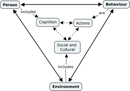 This Concept Map, created with IHMC CmapTools, has information related to: Triadic Reciprocality Model, Person Behaviour, Actions Social and Cultural, Environment includes Social and Cultural, Behaviour Environment, Person includes Cognition, Person Environment, Cognition Actions, Behaviour are Actions, Cognition Social and Cultural
