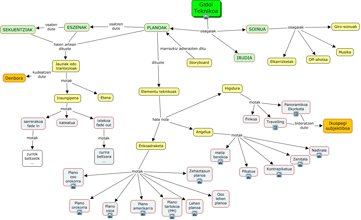 This Concept Map has information related to: Gidoi_teknikoa, Jauziak edo trantsizioak motak Iraungipena, ESZENAK osaten dute SEKUENTZIAK, ixtekoa fade out motak zurira beltzera ..., Enkoadraketa motak Zehaztasun planoa, Higidura motak Panoramikoa Ekorketa, Angelua motak Zenitala, Higidura motak Travelling, Enkoadraketa motak Lehen planoa, Enkoadraketa motak Plano tartekoa (PM), Gidoi Teknikoa osagaiak PLANOAK