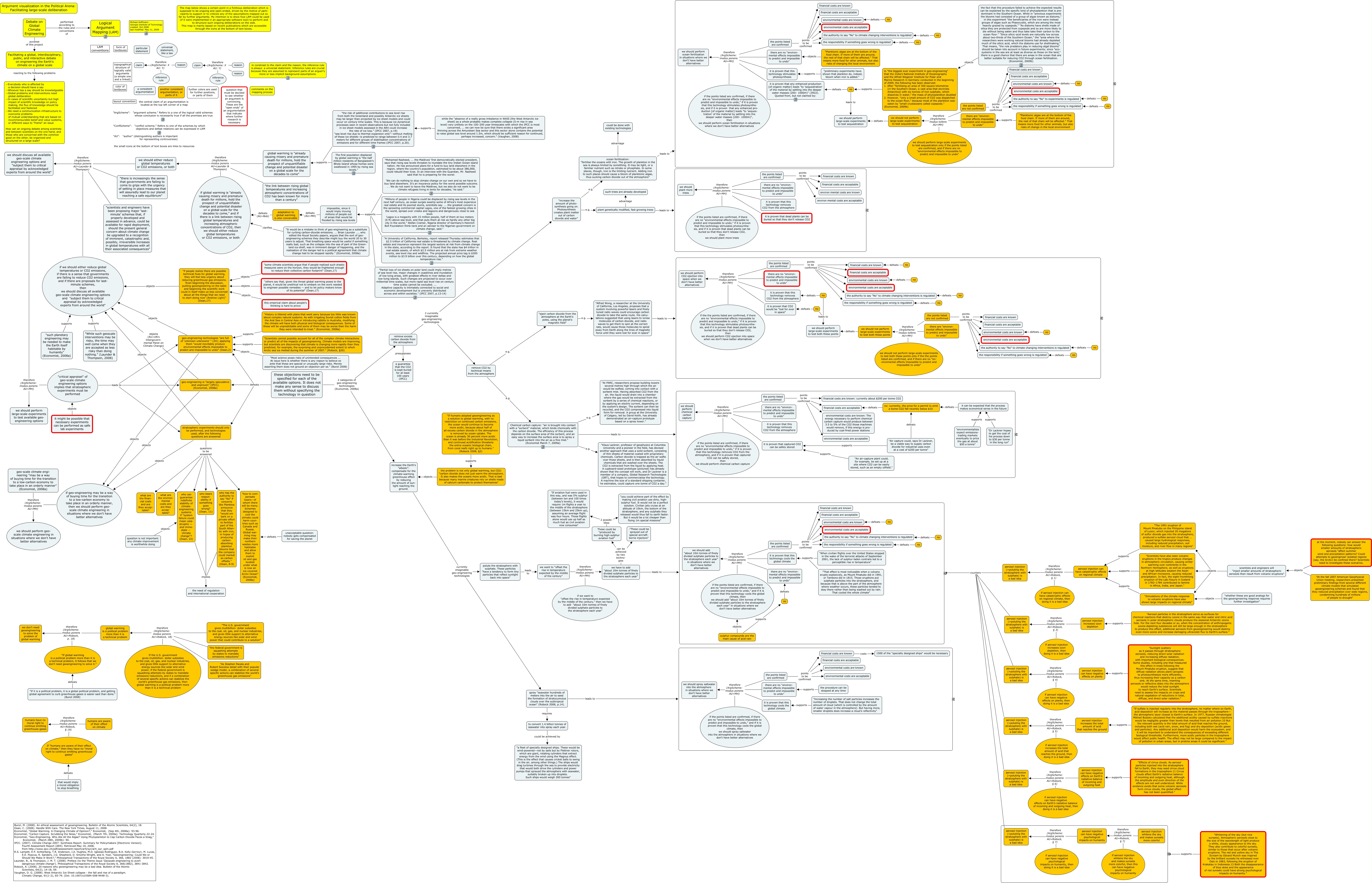 This Concept Map, created with IHMC CmapTools, has information related to: debate on geo-engineering, "When civilian flights over the United States stopped in the wake of the terrorist attacks of September 2001, the lack of sulphur-laden contrails led to a perceptible rise in temperature" supports it is proven that this technology cools the global climate, aerosol injection can have catastrophic effects on regional climate therefore (ArgScheme: modus ponens AU=Robock, § 1) aerosol injection (=poluting the stratosphere with sulphate) is a bad idea, "The U.S. government gives multibillion- dollar subsidies to the coal, oil, gas, and nuclear industries, and gives little support to alternative energy sources like solar and wind power that could contribute to a solution" therefore (ArgScheme: modus ponens AU=Robock, 18) global warming is a political problem more than it is a technical problem, These could be "produced by burning high-sulphur aviation fuel" 2 possibi- lities "If aviation fuel were used in this way, and was 5% sulphur (between ten and 100 times today’s levels), it would require 1m flights a year to the middle of the stratosphere (between 15km and 25km up), assuming an average flight was four hours. Those flights alone would use up half as much fuel as civil aviation now consumes", no defeats the authority to say "No" to climate changing interventions is regulated, "the federal government is squashing attempts by states to mandate emissions reductions" therefore (ArgScheme: modus ponens AU=Robock, 18) global warming is a political problem more than it is a technical problem, no defeats environmental costs are known, "Aerosol particles in the stratosphere serve as surfaces for chemical reactions that destroy ozone in the same way that water and nitric acid aerosols in polar stratospheric clouds produce the seasonal Antarctic ozone hole. For the next four decades or so, when the concentration of anthropogenic ozone-depleting substances will still be large enough in the stratosphere to produce this effect, additional aerosols from geoengineering would destroy even more ozone and increase damaging ultraviolet flux to Earth’s surface." supports aerosol injection increases ozon depletion, the points listed are confirmed points to be confirmed the responsibility if something goes wrong is regulated, the points listed are confirmed therefore (ArgScheme: modus ponens AU=MH) we should perform chemical carbon capture, the points listed are not confirmed points to be confirmed financial costs are known, the points listed are confirmed points to be confirmed the responsibility if something goes wrong is regulated, it is proven that CO2 would be "lost for ever in space" therefore (ArgScheme: modus ponens AU=MH) we should perform CO2 ejection into space when we don't have better alternatives, "A University of California, Berkeley, report released Thursday estimates that $2.5 trillion of California real estate is threatened by climate change. Real estate and insurance represent the largest sectors at risk from climate change in the state, according to the report. It found that the state has $4 trillion in real estate assets, of which $2.5 million are at risk from extreme weather events, sea level rise and wildfires. The projected annual price tag is $300 million to $3.9 billion over this century, depending on how the global temperature rise." supports impossible, since it would imply moving millions of people out of areas that would be flooded by rising sea levels, "environmentalists expect emissions- trading markets eventually to price the gas at about $50 a tonne" supports it can be expected that the process makes economical sense in the future, "History is littered with plans that went awry because too little was known about complex natural systems. As with irrigating Soviet cotton fields from the Aral Sea in Central Asia or introducing rabbits to Australia, modifying the climate will have both physical and biological consequences. Some of these will be unpredictable and some of them may be worse than the harm they were intended to treat." (Economist, 2008a) supports geo-engineering technologies "are full of 'unknown unknowns' " (24); applying them "would inevitably produce environmental effects impossible to predict and impossible to undo" (Dean,2), if we want to "offset the rise in temperature expected by the middle of the century," then we have to add "about 10m tonnes of finely divided sulphate particles to the stratosphere each year" therefore (ArgScheme: modus ponens AU=MH) we have to add "about 10m tonnes of finely divided sulphate particles to the stratosphere each year", if we should either reduce global temperatures or CO2 emissions, if there is a sense that governments are failing to reduce CO2 emissions, and if there are proposals for last- minute schemes, then we should discuss all available geo-scale climate engineering options and "subject them to critical appraisal by acknowledged experts from around the world" therefore (ArgScheme: modus ponens AU=Launder & Thompson) we should discuss all available geo-scale climate engineering options and "subject them to critical appraisal by acknowledged experts from around the world", "If global warming is a political problem more than it is a technical problem, it follows that we don’t need geoengineering to solve it." therefore (ArgScheme: modus ponens AU=Robock, p. 18) we don’t need geoengineering to solve the problem of global warming, no defeats the authority to say "No" to climate changing interventions is regulated