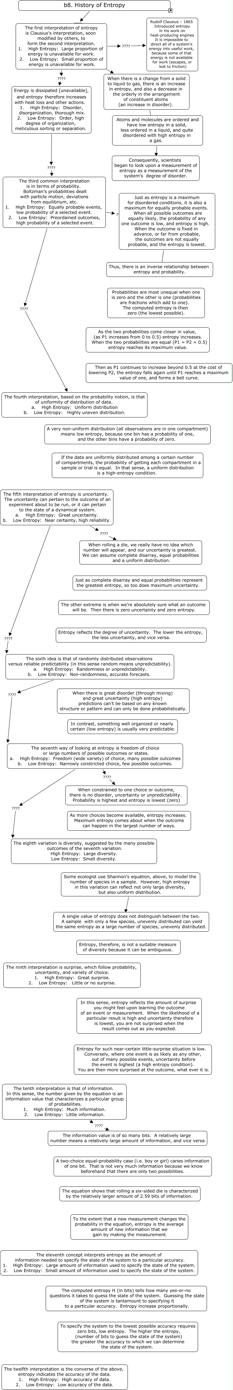 This Concept Map, created with IHMC CmapTools, has information related to: b8. History of Entropy, Atoms and molecules are ordered and have low entropy in a solid, less ordered in a liquid, and quite disordered with high entropy in a gas. ???? Consequently, scientists began to look upon a measurement of entropy as a measurement of the system’s degree of disorder., When there is a change from a solid to liquid to gas, there is an increase in entropy, and also a decrease in the orderly in the arrangement of constituent atoms (an increase in disorder). ???? Atoms and molecules are ordered and have low entropy in a solid, less ordered in a liquid, and quite disordered with high entropy in a gas., The tenth interpretation is that of information. In this sense, the number given by the equation is an information value that characterizes a particular group of probabilities. 1. High Entropy: Much information. 2. Low Entropy: Little information. ???? The information value is of so many bits. A relatively large number means a relatively large amount of information, and vice versa, The third common interpretation is in terms of probability. Boltzman’s probabilities dealt with particle motion, deviations from equilibrium, etc. 1. High Entropy: Equally probable events, low probability of a selected event. 2. Low Entropy: Preordained outcomes, high probability of a selected event. ???? Just as entropy is a maximum for disordered conditions, it is also a maximum for equally probable events. When all possible outcomes are equally likely, the probability of any one outcome is low, and entropy is high. When the outcome is fixed in advance, or far from probable, the outcomes are not equally probable, and the entropy is lowest., Energy is dissipated [unavailable], and entropy therefore increases with heat loss and other actions. 1. High Entropy: Disorder, disorganization, thorough mix. 2. Low Entropy: Order, high degree of organization, meticulous sorting or separation. ???? The third common interpretation is in terms of probability. Boltzman’s probabilities dealt with particle motion, deviations from equilibrium, etc. 1. High Entropy: Equally probable events, low probability of a selected event. 2. Low Entropy: Preordained outcomes, high probability of a selected event., Just as entropy is a maximum for disordered conditions, it is also a maximum for equally probable events. When all possible outcomes are equally likely, the probability of any one outcome is low, and entropy is high. When the outcome is fixed in advance, or far from probable, the outcomes are not equally probable, and the entropy is lowest. ???? Thus, there is an inverse relationship between entropy and probability., The seventh way of looking at entropy is freedom of choice or large numbers of possible outcomes or states. a. High Entropy: Freedom (wide variety) of choice, many possible outcomes b. Low Entropy: Narrowly constricted choice, few possible outcomes. ???? When constrained to one choice or outcome, there is no disorder, uncertainty or unpredictability. Probability is highest and entropy is lowest (zero), The first interpretation of entropy is Clausius’s interpretation, soon modified by others, to form the second interpretation. 1. High Entropy: Large proportion of energy is unavailable for work. 2. Low Entropy: Small proportion of energy is unavailable for work. ???? When there is a change from a solid to liquid to gas, there is an increase in entropy, and also a decrease in the orderly in the arrangement of constituent atoms (an increase in disorder)., The fifth interpretation of entropy is uncertainty. The uncertainty can pertain to the outcome of an experiment about to be run, or it can pertain to the state of a dynamical system. a. High Entropy: Great uncertainty. b. Low Entropy: Near certainty, high reliability. ???? The sixth idea is that of randomly distributed observations versus reliable predictability (in this sense random means unpredictability). a. High Entropy: Randomness or unpredictability. b. Low Entropy: Non-randomness, accurate forecasts., b8. History of Entropy ???? The first interpretation of entropy is Clausius’s interpretation, soon modified by others, to form the second interpretation. 1. High Entropy: Large proportion of energy is unavailable for work. 2. Low Entropy: Small proportion of energy is unavailable for work., The sixth idea is that of randomly distributed observations versus reliable predictability (in this sense random means unpredictability). a. High Entropy: Randomness or unpredictability. b. Low Entropy: Non-randomness, accurate forecasts. ???? The seventh way of looking at entropy is freedom of choice or large numbers of possible outcomes or states. a. High Entropy: Freedom (wide variety) of choice, many possible outcomes b. Low Entropy: Narrowly constricted choice, few possible outcomes., The seventh way of looking at entropy is freedom of choice or large numbers of possible outcomes or states. a. High Entropy: Freedom (wide variety) of choice, many possible outcomes b. Low Entropy: Narrowly constricted choice, few possible outcomes. ???? The eighth variation is diversity, suggested by the many possible outcomes of the seventh variation. High Entropy: Large diversity. Low Entropy: Small diversity., The third common interpretation is in terms of probability. Boltzman’s probabilities dealt with particle motion, deviations from equilibrium, etc. 1. High Entropy: Equally probable events, low probability of a selected event. 2. Low Entropy: Preordained outcomes, high probability of a selected event. ???? The fourth interpretation, based on the probability notion, is that of uniformity of distribution of data. a. High Entropy: Uniform distribution b. Low Entropy: Highly uneven distribution., The first interpretation of entropy is Clausius’s interpretation, soon modified by others, to form the second interpretation. 1. High Entropy: Large proportion of energy is unavailable for work