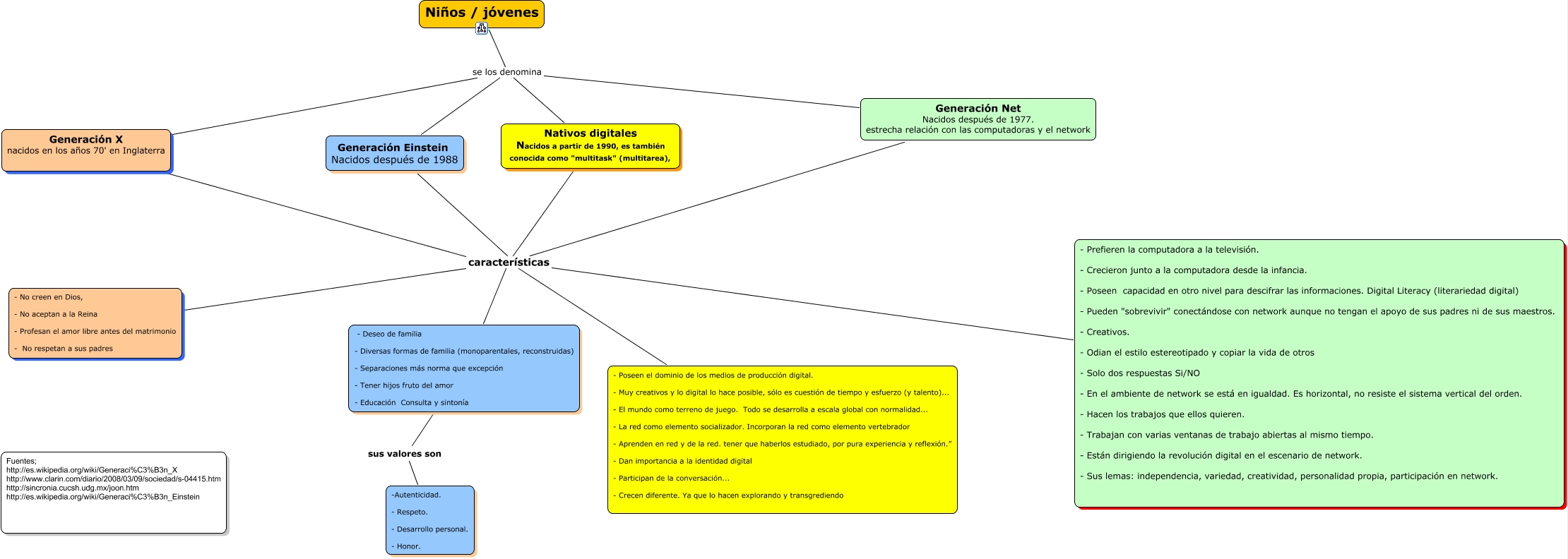 Este Cmap, tiene información relacionada con: niños y jóvenes 2, Generación X nacidos en los años 70' en Inglaterra características - Poseen el dominio de los medios de producción digital. - Muy creativos y lo digital lo hace posible, sólo es cuestión de tiempo y esfuerzo (y talento)... - El mundo como terreno de juego. Todo se desarrolla a escala global con normalidad... - La red como elemento socializador. Incorporan la red como elemento vertebrador - Aprenden en red y de la red. tener que haberlos estudiado, por pura experiencia y reflexión.” - Dan importancia a la identidad digital - Participan de la conversación... - Crecen diferente. Ya que lo hacen explorando y transgrediendo, Niños / jóvenes se los denomina Generación X nacidos en los años 70' en Inglaterra, Generación Net Nacidos después de 1977. estrecha relación con las computadoras y el network características - Deseo de familia - Diversas formas de familia (monoparentales, reconstruidas) - Separaciones más norma que excepción - Tener hijos fruto del amor - Educación Consulta y sintonía, Generación X nacidos en los años 70' en Inglaterra características - Deseo de familia - Diversas formas de familia (monoparentales, reconstruidas) - Separaciones más norma que excepción - Tener hijos fruto del amor - Educación Consulta y sintonía, Generación X nacidos en los años 70' en Inglaterra características - No creen en Dios, - No aceptan a la Reina - Profesan el amor libre antes del matrimonio - No respetan a sus padres, Generación Einstein Nacidos después de 1988 características - Poseen el dominio de los medios de producción digital. - Muy creativos y lo digital lo hace posible, sólo es cuestión de tiempo y esfuerzo (y talento)... - El mundo como terreno de juego. Todo se desarrolla a escala global con normalidad... - La red como elemento socializador. Incorporan la red como elemento vertebrador - Aprenden en red y de la red. tener que haberlos estudiado, por pura experiencia y reflexión.” - Dan importancia a la identidad digital - Participan de la conversación... - Crecen diferente. Ya que lo hacen explorando y transgrediendo, Generación Net Nacidos después de 1977. estrecha relación con las computadoras y el network características - Poseen el dominio de los medios de producción digital. - Muy creativos y lo digital lo hace posible, sólo es cuestión de tiempo y esfuerzo (y talento)... - El mundo como terreno de juego. Todo se desarrolla a escala global con normalidad... - La red como elemento socializador. Incorporan la red como elemento vertebrador - Aprenden en red y de la red. tener que haberlos estudiado, por pura experiencia y reflexión.” - Dan importancia a la identidad digital - Participan de la conversación... - Crecen diferente. Ya que lo hacen explorando y transgrediendo, Generación Net Nacidos después de 1977. estrecha relación con las computadoras y el network características - Prefieren la computadora a la televisión. - Crecieron junto a la computadora desde la infancia. - Poseen capacidad en otro nivel para descifrar las informaciones. Digital Literacy (literariedad digital) - Pueden "sobrevivir" conectándose con network aunque no tengan el apoyo de sus padres ni de sus maestros. - Creativos. - Odian el estilo estereotipado y copiar la vida de otros - Solo dos respuestas Si/NO - En el ambiente de network se está en igualdad. Es horizontal, no resiste el sistema vertical del orden. - Hacen los trabajos que ellos quieren. - Trabajan con varias ventanas de trabajo abiertas al mismo tiempo. - Están dirigiendo la revolución digital en el escenario de network. - Sus lemas: independencia, variedad, creatividad, personalidad propia, participación en network., Nativos digitales Nacidos a partir de 1990, es también conocida como "multitask" (multitarea), características - No creen en Dios, - No aceptan a la Reina - Profesan el amor libre antes del matrimonio - No respetan a sus padres, Nativos digitales Nacidos a partir de 1990, es también conocida como "multitask" (multitarea), características - Poseen el dominio de los medios de producción digital. - Muy creativos y lo digital lo hace posible, sólo es cuestión de tiempo y esfuerzo (y talento)... - El mundo como terreno de juego. Todo se desarrolla a escala global con normalidad... - La red como elemento socializador. Incorporan la red como elemento vertebrador - Aprenden en red y de la red. tener que haberlos estudiado, por pura experiencia y reflexión.” - Dan importancia a la identidad digital - Participan de la conversación... - Crecen diferente. Ya que lo hacen explorando y transgrediendo, Nativos digitales Nacidos a partir de 1990, es también conocida como "multitask" (multitarea), características - Prefieren la computadora a la televisión. - Crecieron junto a la computadora desde la infancia. - Poseen capacidad en otro nivel para descifrar las informaciones. Digital Literacy (literariedad digital) - Pueden "sobrevivir" conectándose con network aunque no tengan el apoyo de sus padres ni de sus maestros. - Creativos. - Odian el estilo estereotipado y copiar la vida de otros - Solo dos respuestas Si/NO - En el ambiente de network se está en igualdad. Es horizontal, no resiste el sistema vertical del orden. - Hacen los trabajos que ellos quieren. - Trabajan con varias ventanas de trabajo abiertas al mismo tiempo. - Están dirigiendo la revolución digital en el escenario de network. - Sus lemas: independencia, variedad, creatividad, personalidad propia, participación en network., Niños / jóvenes se los denomina Generación Einstein Nacidos después de 1988, Niños / jóvenes se los denomina Generación Net Nacidos después de 1977. estrecha relación con las computadoras y el network, - Deseo de familia - Diversas formas de familia (monoparentales, reconstruidas) - Separaciones más norma que excepción - Tener hijos fruto del amor - Educación Consulta y sintonía sus valores son -Autentic