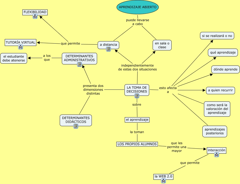 aprendizaje abierto, interacción que permite la WEB 2.0, a distancia que permite TUTOR�?A VIRTUAL, LA TOMA DE DECISIONES presenta dos dimensiones distintas DETERMINANTES ADMINISTRATIVOS, el aprendizaje la toman LOS PROPIOS ALUMNOS, APRENDIZAJE ABIERTO puede llevarse a cabo a distancia, LOS PROPIOS ALUMNOS que les permite una mayor interacción, DETERMINANTES ADMINISTRATIVOS a los que el estudiante debe atenerse, LA TOMA DE DECISIONES esto afecta a si se realizará o no, LA TOMA DE DECISIONES sobre el aprendizaje, LA TOMA DE DECISIONES esto afecta a a quien recurrir