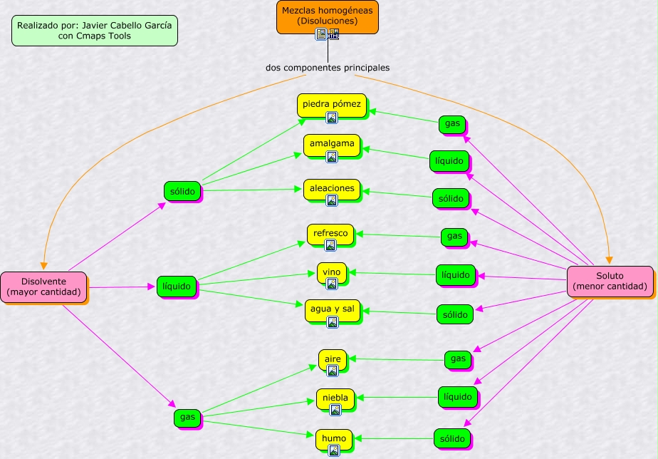 Este mapa conceptual tiene información relacionada a: disoluciones, líquido amalgama, Disolvente (mayor cantidad) líquido, Disolvente (mayor cantidad) gas, gas humo, líquido refresco, Soluto (menor cantidad) líquido, Soluto (menor cantidad) líquido, Soluto (menor cantidad) sólido, sólido aleaciones, Soluto (menor cantidad) líquido, Mezclas homogéneas (Disoluciones) dos componentes principales Disolvente (mayor cantidad), líquido niebla, líquido vino, gas niebla, líquido agua y sal, Soluto (menor cantidad) sólido, gas aire, gas piedra pómez, Disolvente (mayor cantidad) sólido, Soluto (menor cantidad) gas